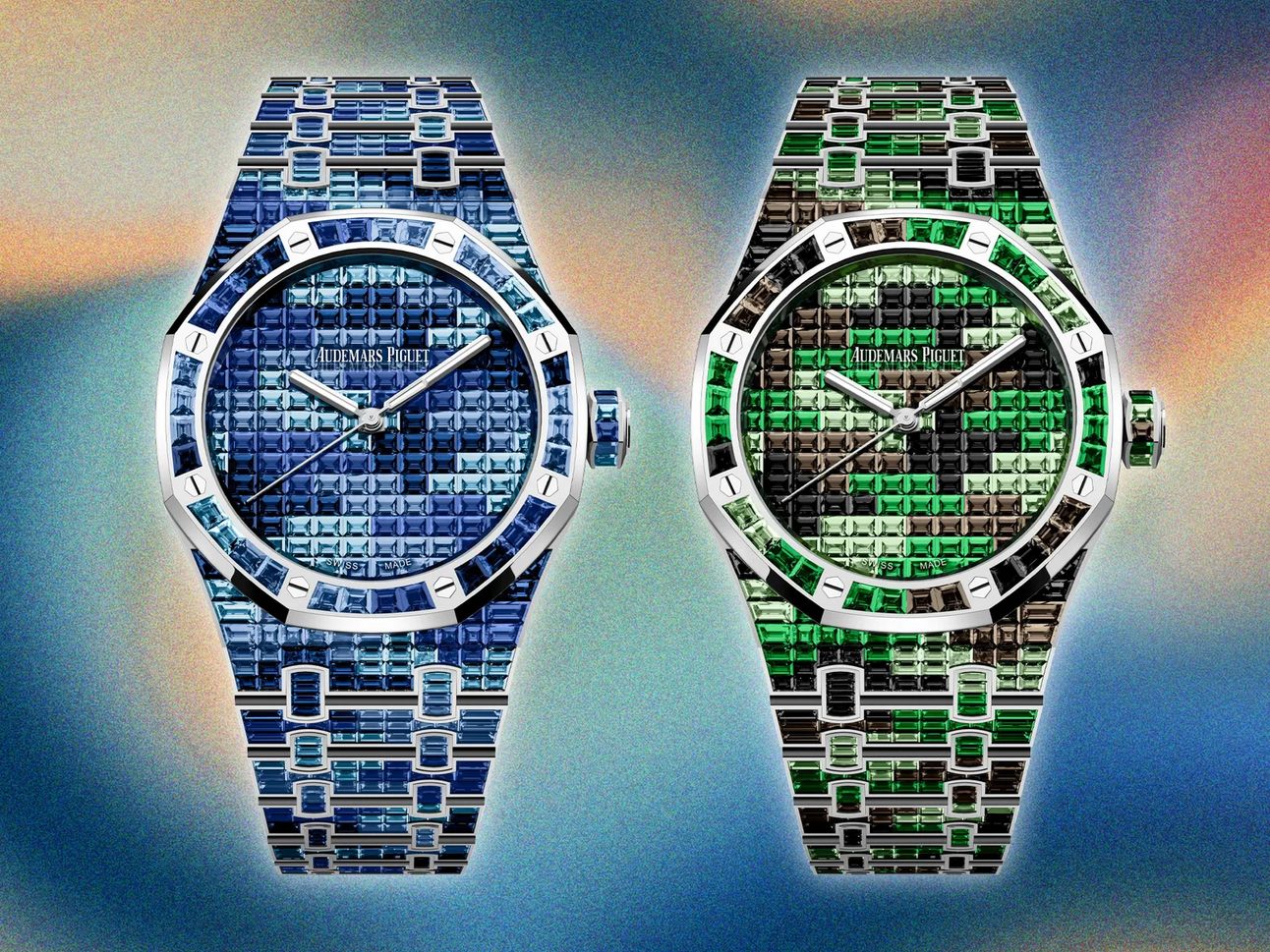 The Royal Oak line also sees exciting additions with the Selfwinding Full Gemset models, which boast a camouflage pattern made from 861 baguette-cut gemstones in two color schemes: shades of blue and a mix of green, brown, and black. This design choice reflects a playful yet luxurious reinterpretation of the classic luxury sports watch, echoing themes from Pharrell's debut LV collection.