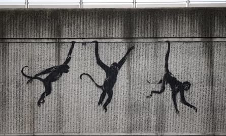 Following the goat, Banksy's installations included two elephant heads with trunks outstretched toward each other in Chelsea, and three monkeys strategically placed on a bridge in Brick Lane, each artwork adding to the urban menagerie. The imagery continued with a howling wolf on a satellite dish in Peckham, portrayed as if it were the full moon, which unfortunately was stolen shortly after its installation.