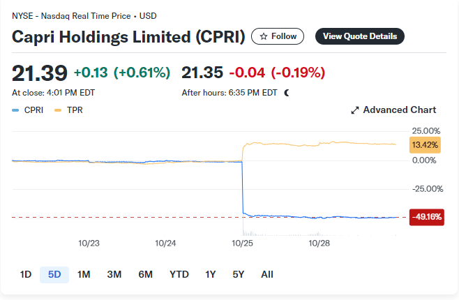 Capri Holdings' stock plummeted by approximately 47% in early trading on October 25, 2024, following a U.S. judge's decision to block its $8.5 billion acquisition by Tapestry, the owner of Coach. The court ruling was delivered by U.S. District Judge Jennifer Rochon, who cited concerns over reduced competition in the accessible-luxury handbag market. This decision was highlighted in a Yahoo Finance report which quoted Rochon's statement that "antitrust has come into fashion."