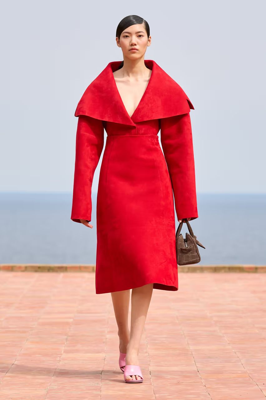 Sculpture, a recurring theme in Jacquemus’ designs, played a significant role. Stiff gowns shaped like cones, wool coats with triangular lapels, and tops that bloomed around models’ waists like rigid artworks were standout pieces. A suede green top featured ballooning sleeves, reminiscent of Gigi Hadid’s look from last season. Bold accessories like vivid leather belts, lunchbox-shaped handbags (the Pochette Rond Carré), circular totes, and zebra loafers took center stage.